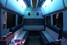 The smallest vehicle in our fleet is our 10 passenger party van. This silver van looks like a simple van on the outside, but inside there is a fully customized limo interior! This vehicle has wrap around leather seating, hardwood floors, custom ceiling, granite topped bar and cooler, flat screen TV with DVD/BluRay player, MP3/iPod hookup, an amazing sound system, and beautiful color-changing lights! If you're looking a vehicle to accommodate a small group who wants all the luxury of a larger bus, this is it!